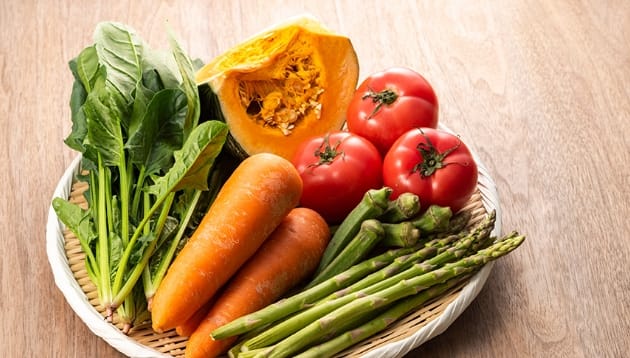 にんじん、ほうれん草、かぼちゃ、チンゲン菜、ニラ、しそなどの緑黄色野菜。