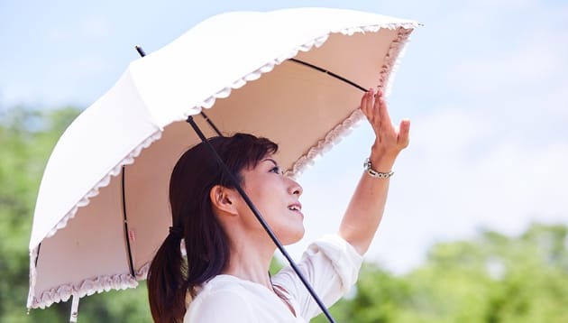 紫外線による肌へのダメージを減らすために日焼け対策を行いましょう。日焼け止めをしっかりと塗り日傘などで直射日光を避けましょう。